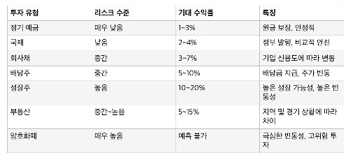 • 단기적인 목표라면 안전한 채권이나 정기 예금이 적합하지만, 장기적인 목표라면 주식, ETF, 부동산 투자 등 더 높은 수익을 기대할 수 있는 자산을 선택할 수 있다.